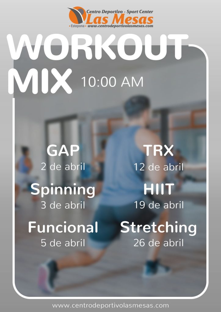 En el Centro Deportivo Las Mesas abril llega cargado de energía primaveral y con una programación de Workout Mix más completa que nunca. Este mes contamos con seis clases dirigidas diferentes, todas a las 10:00 de la mañana, para que tengas una razón de sobra para empezar el día con movimiento cada domingo y festivo. Variedad, motivación y buen ambiente en tu gimnasio de Estepona.
